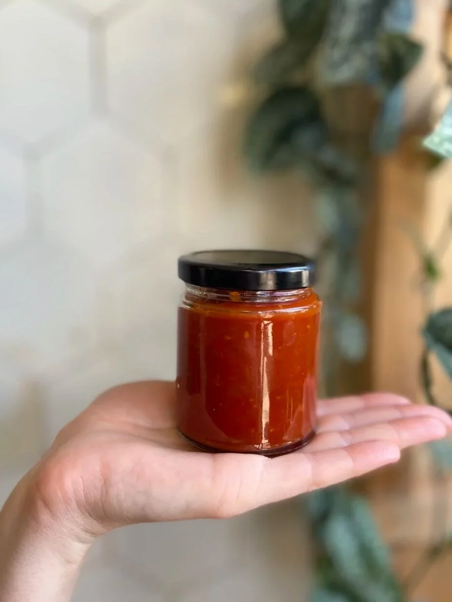 Tined Martinez plum tomatoes, fresh ginger, shallots and garlic with organic Britsh caster sugar and white wine vinegar.